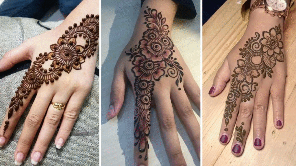 इसमें मोटी बेलें, पत्तियाँ और फूलों के पैटर्न बनाए जाते हैं, जो उंगलियों से शुरू होकर कलाई तक फैले होते हैं।डिज़ाइन की खासियत यह है कि यह साफ-सुथरा दिखता है और जल्दी बन जाता है।आप चाहें तो इसमें थोड़े गोल-पैटर्न या डॉट्स जोड़कर इसे और स्टाइलिश बना सकती हैं।