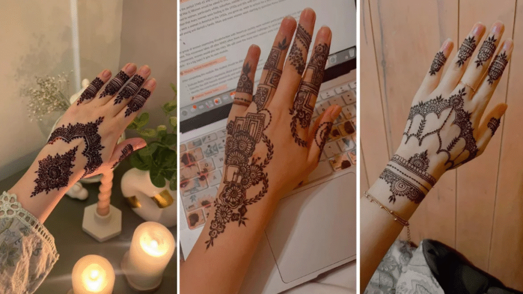 ट्रेंड में चल रहे: साफ-सुथरी लाइनें, हल्के मोटिफ्स और खाली जगह यानी नेगेटिव स्पेस 2025 में बेहद पॉपुलर है। ऐसी डिज़ाइन प्री-वेडिंग फंक्शन्स या कैज़ुअल लुक के लिए खास हैं। यह कम समय में बन जाती हैं और हाथों की खूबसूरती को बढ़ाती हैं.