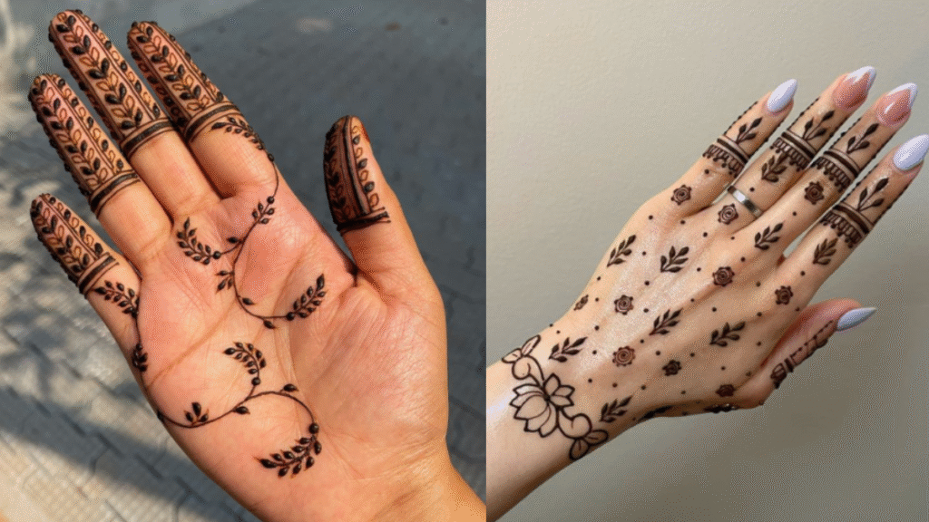 अगर आप कुछ हल्का-फुल्का और कम समय लेने वाला डिज़ाइन पसंद करती हैं, तो सिंपल मेहंदी सबसे अच्छा विकल्प है। इसमें छोटे-छोटे डॉट्स, फूल और किनारों पर हल्की डिटेलिंग होती है। यह डिजाइन हाथों को एक सूक्ष्म और खूबसूरत लुक देने के लिए बढ़िया है।